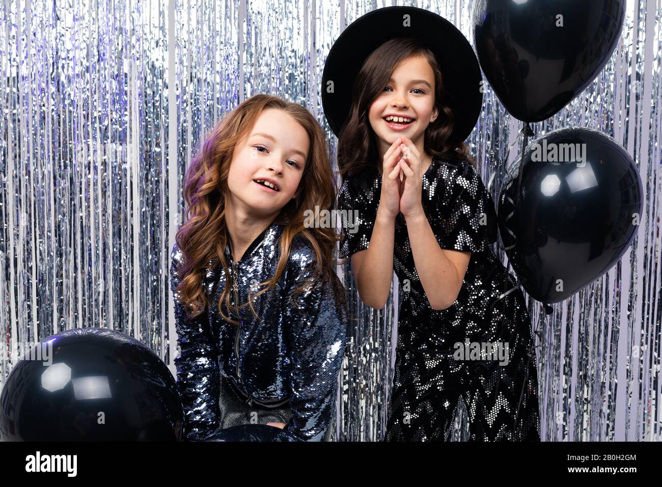 Black Friday Two Cute Stylish Young Girls In Holiday Dresses With Black Balloons On A Shiny Background Stock Photo Alamy