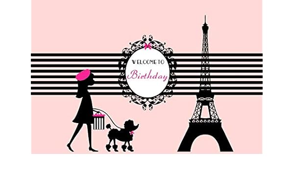 Amazon Com Laeacco Welcome To Birthday Background 7x5ft Eiffel Tower Vinyl Photography Backdrop Black Stripe Cute Girl And Puppy Dog Girls Woman Children Party Banner Poster Photo Props Studio Decor Paris